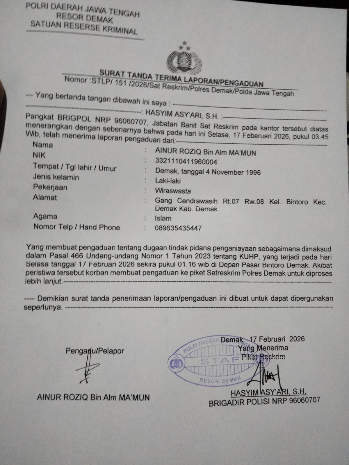 Demak |DerapAdvokasi.com| 18 Februari 2026 – Dugaan tindakan penganiayaan terhadap seorang juru parkir (jukir) berinisial AR di depan Pasar Bintoro mengejutkan masyarakat.